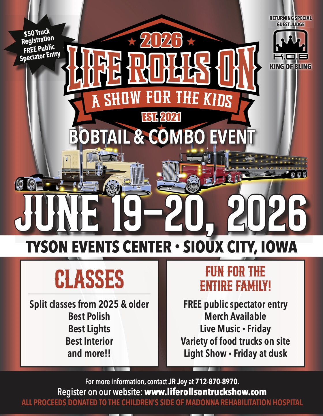 Join us as a sponsor for the 2026 Life Rolls On Trucking Show! Your support will help raise funds for the children’s side of Madonna Rehabilitation Hospitals of Nebraska, while also providing your company with valuable visibility on show banners and T-shirts. To ensure your logo is featured, please reach out by May 1st, 2026. Let’s make this event impactful together!